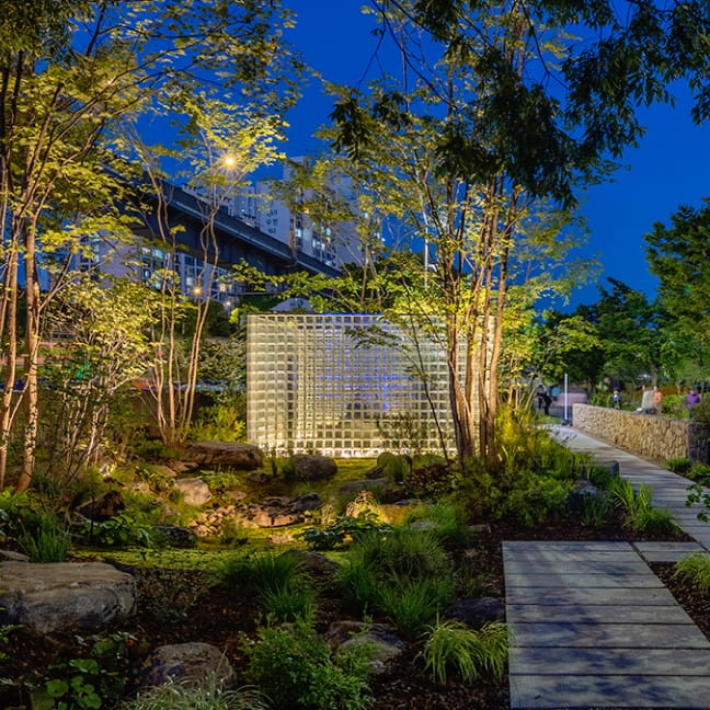 서울국제정원박람회에서 선보인 아이파크 가든은 도심 한가운데 숨겨진 자연의 가치를 보석처럼 빛내는 정원 프로젝트입니다. 아이파크의 간결하고 모던한 디자인 언어 위에, 숲과 유리 블록이 어우러진 미래지향적 자연을 구현했습니다. 주·야간의 감상 포인트를 달리해 24시간 지속 가능한 경관 경험을 완성했으며, 시민과 함께하는 ESG 정원으로 조성되어, 브랜드 가치와 지역사회 공공성을 동시에 담아낸 공간입니다.