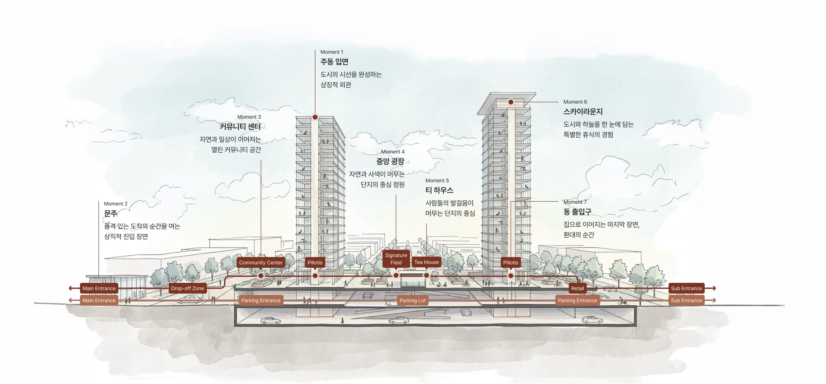 특별한 공간에 도착한 듯 환대받는 경험을 선사합니다.단지로 들어서는 여정의 첫 순간부터,